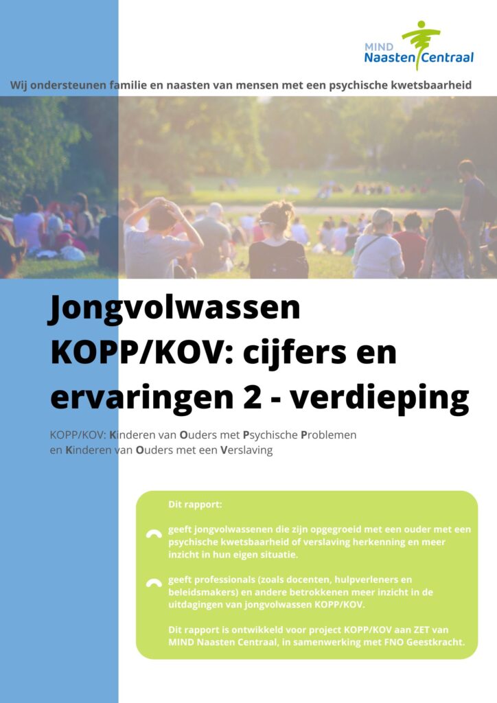 In september 2021 werd het rapport ‘Jongvolwassen KOPP/KOV: cijfers en ervaringen’ gepubliceerd. Dit rapport gaf een eerste inzicht in de uitdagingen van jongvolwassenen (18-35 jaar) die zijn opgegroeid in gezinnen met psychische problemen of verslavingen. Het richtte zich op thema’s zoals zelfbeeld, relaties, grenzen stellen, angst en ondersteuningsbehoeften. Het doel was om jongvolwassen KOPP/KOV herkenning en meer inzicht te bieden in hun eigen situatie en professionals, zoals docenten, hulpverleners en beleidsmakers, bewust te maken van hun ervaringen en behoeften.
